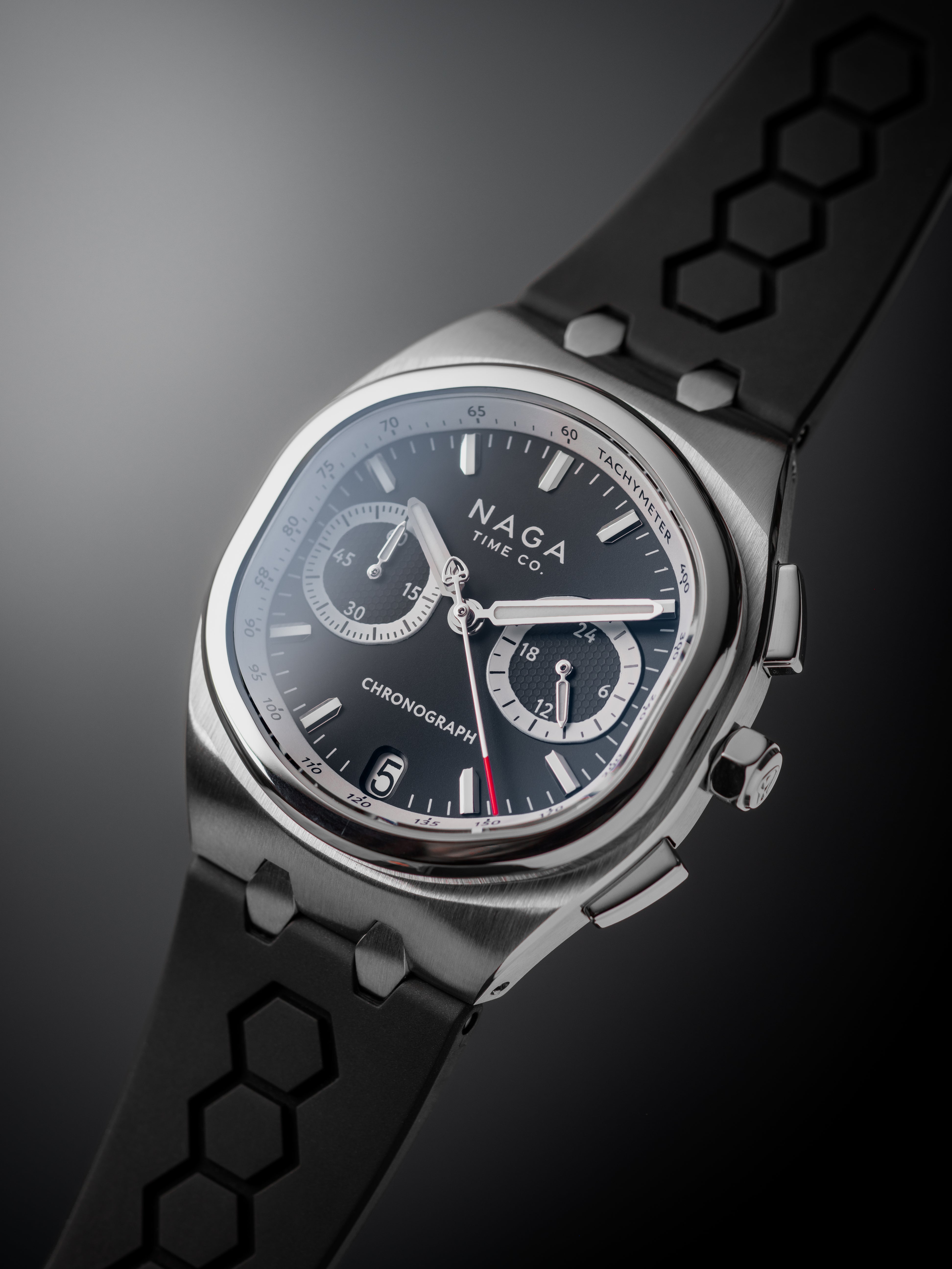 Il segnatempo rimane estremamente confortevole sia con il bracciale NAGA, che conferisce un carattere più raffinato e strutturato, sia con il cinturino in gomma FKM Esaflex™, leggero e resistente, ideale per un utilizzo più dinamico.