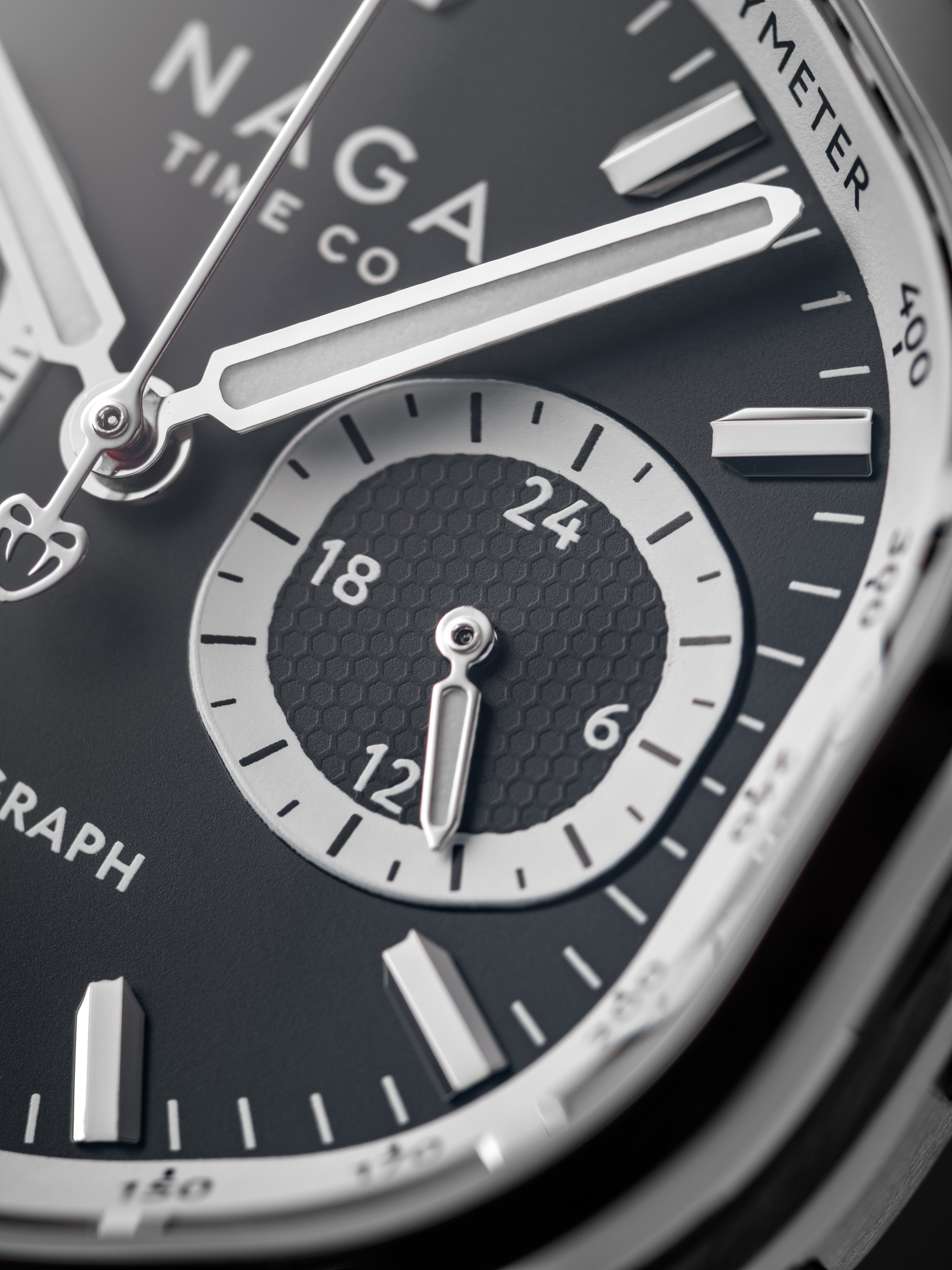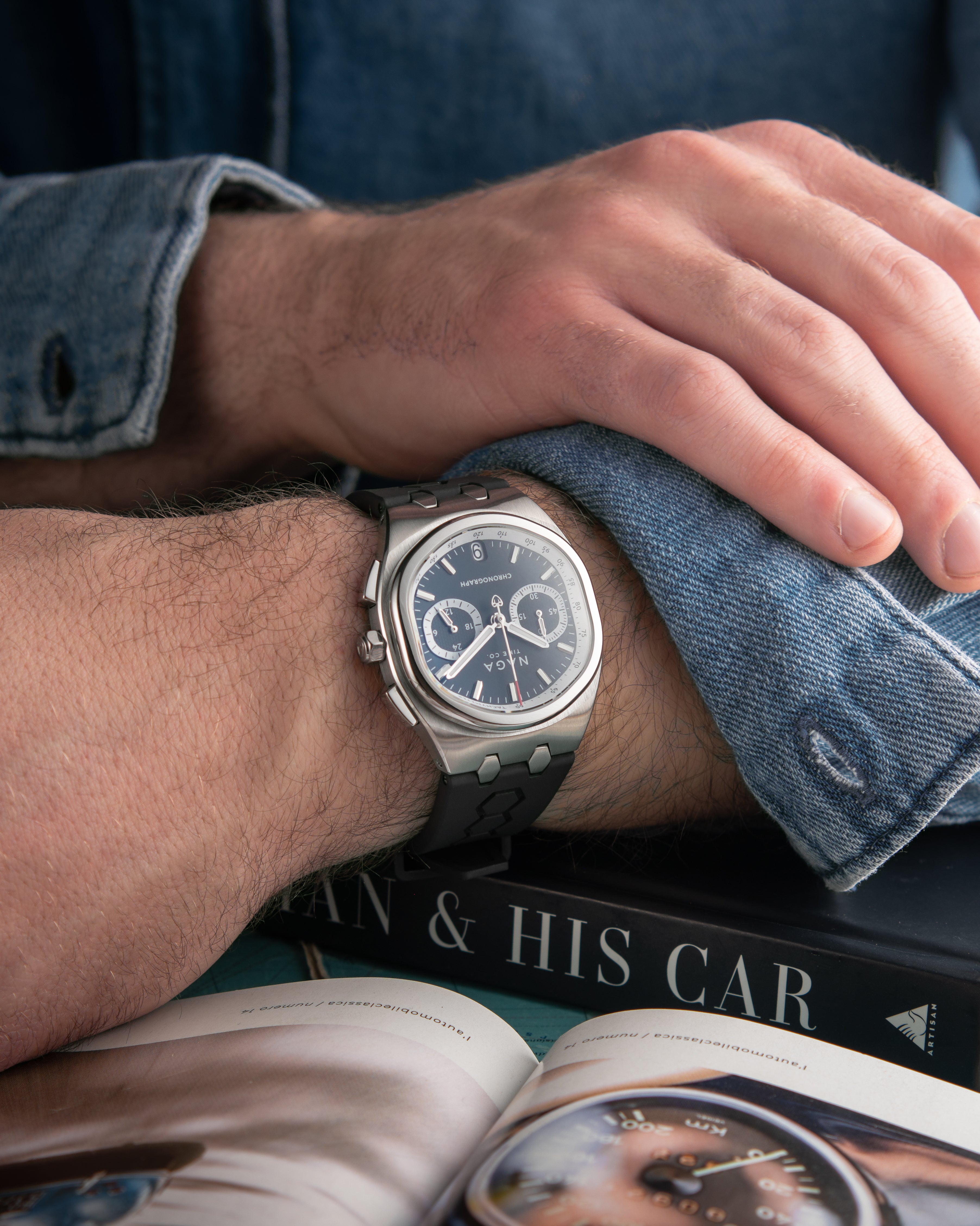 Il contrasto netto tra nero e bianco crea un’estetica funzionale e senza tempo, mentre il design pulito assicura una leggibilità immediata in ogni situazione. Un cronografo pensato per accompagnarti senza interruzioni, proprio come nelle competizioni endurance da cui trae ispirazione.